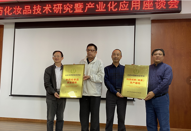 會(huì)上,轉(zhuǎn)化委專家組組長李博鑑、主任委員戰(zhàn)嘉怡代表北京中西醫(yī)結(jié)合學(xué)會(huì)分別向荷琇公司授予《中藥化妝品研發(fā)基地》、《科技成果(醫(yī)美)生產(chǎn)基地》牌匾。